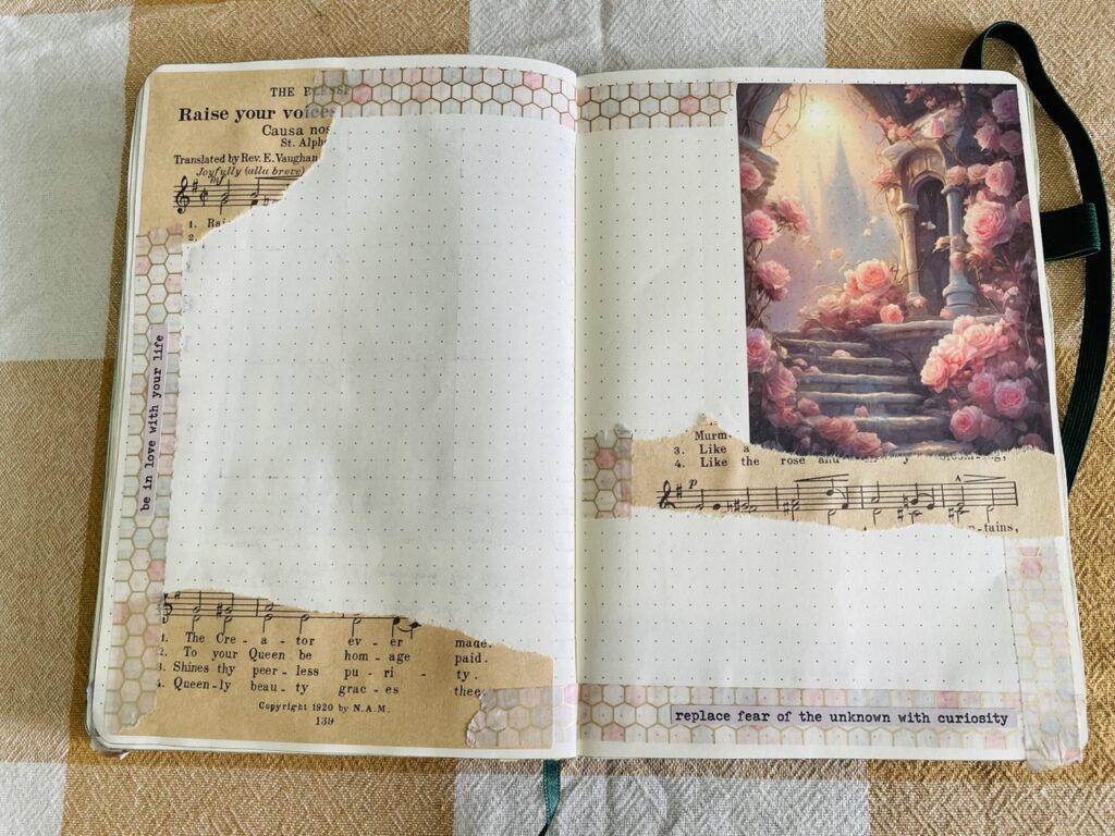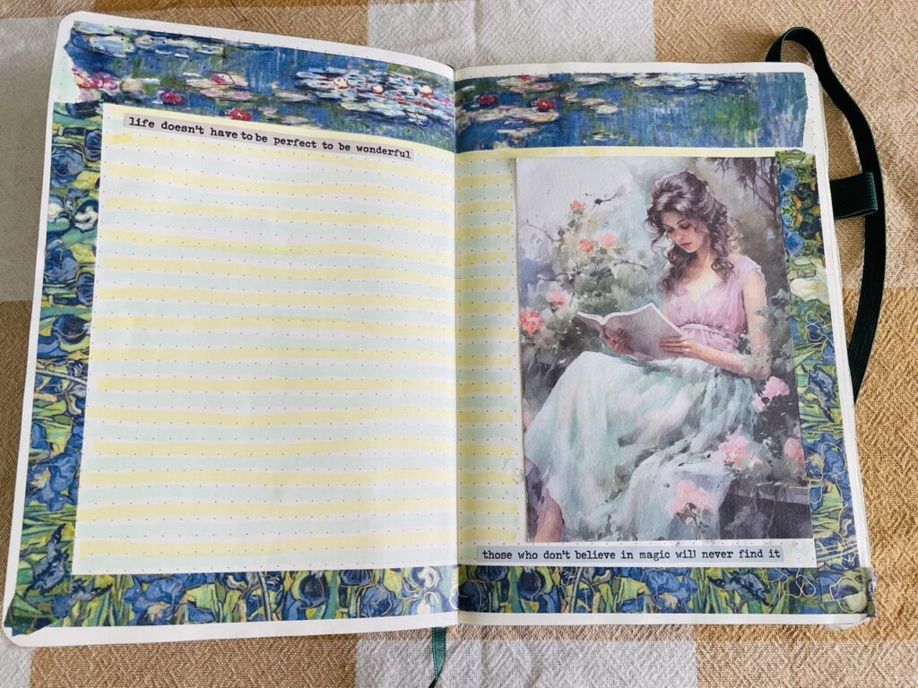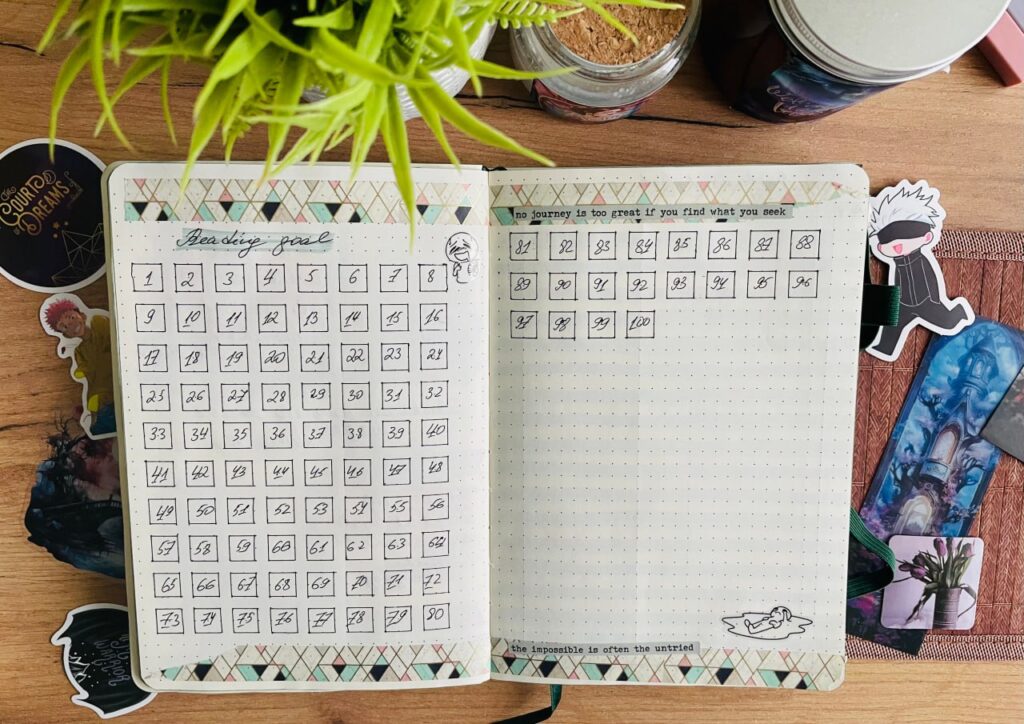 • розвороти для цитат та різних записів — тут політ фантазії безмежний, можна навіть зробити сторінки-трекери для читання книг. Ось, наприклад, трекер для читання «Aurora Borealis» — треба ж якось себе замотивувати до читання товстунця. Як варіант — можна трекати кількість прочитаних розділів за день.