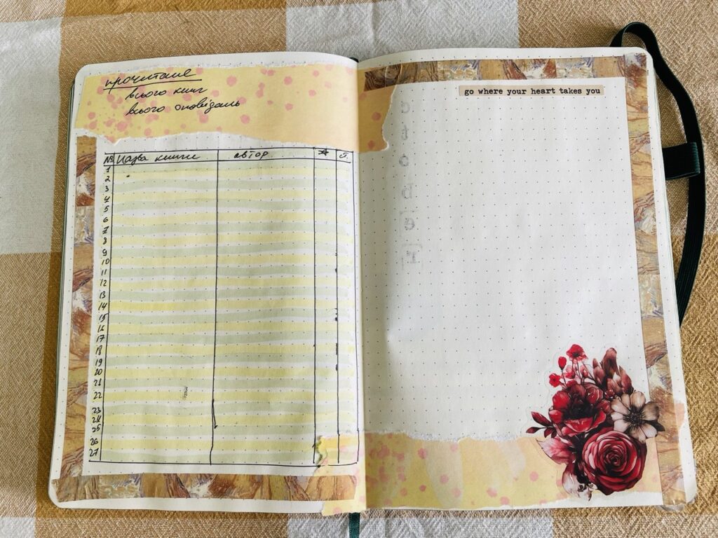 • розворот з таблицею для прочитаних книг і вільним місцем для рефлексій у кінці місяця — тут простенька таблиця з назвою книги, автором, рейтингом та кількістю сторінок, за бажанням можна додати дату прочитання чи формат книги (аудіо, паперова чи електронна).