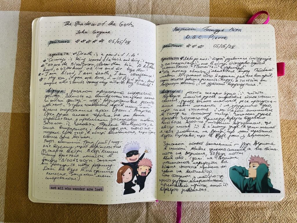 А ще можна створювати розвороти з відгуками на книжки. Це особливо класно, коли є бажання розписати всі враження детально. Ось приклади з моїх попередніх щоденників для натхнення: