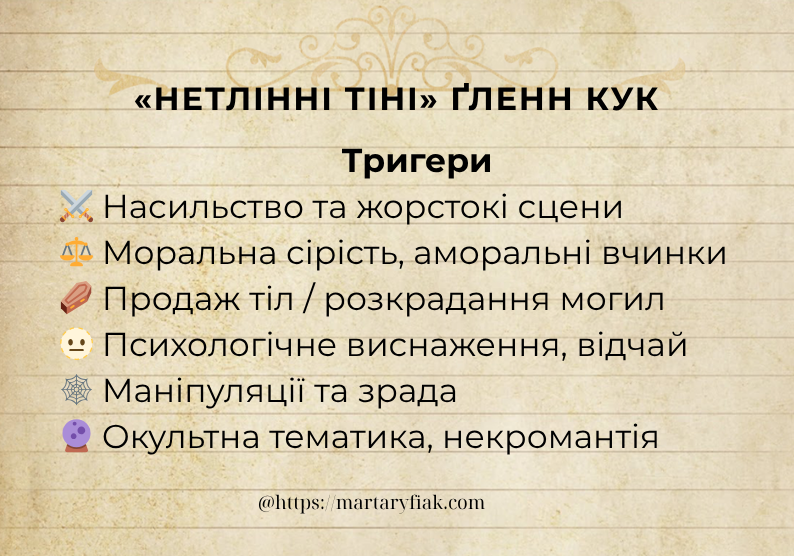 В цій частині мені заімпонував стиль Кука — лаконічний, але дуже точний. Він не перевантажує деталями, а залишає простір для уяви. У кожному короткому реченні є щось колюче, справжнє, і завдяки цьому світ Чорної Роти здається не вигаданим, а відчутним. Саме цей «жорсткий реалізм» у фентезі Кука мене захопив. Магія тут не декоративна, а така, що пахне димом, кров’ю і страхом.